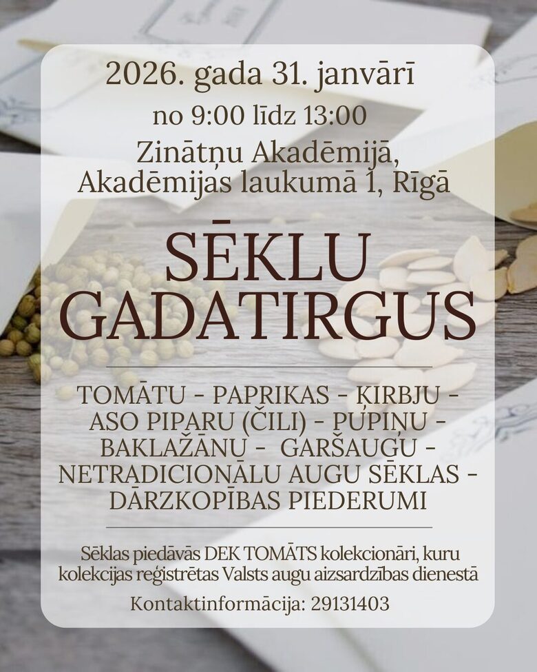 - Весенняя ярмарка семян состоится 31 января с 9:00 до 13:00 в Латвийской академии наук, Akademijas laukums, 1, Рига. 3 этаж